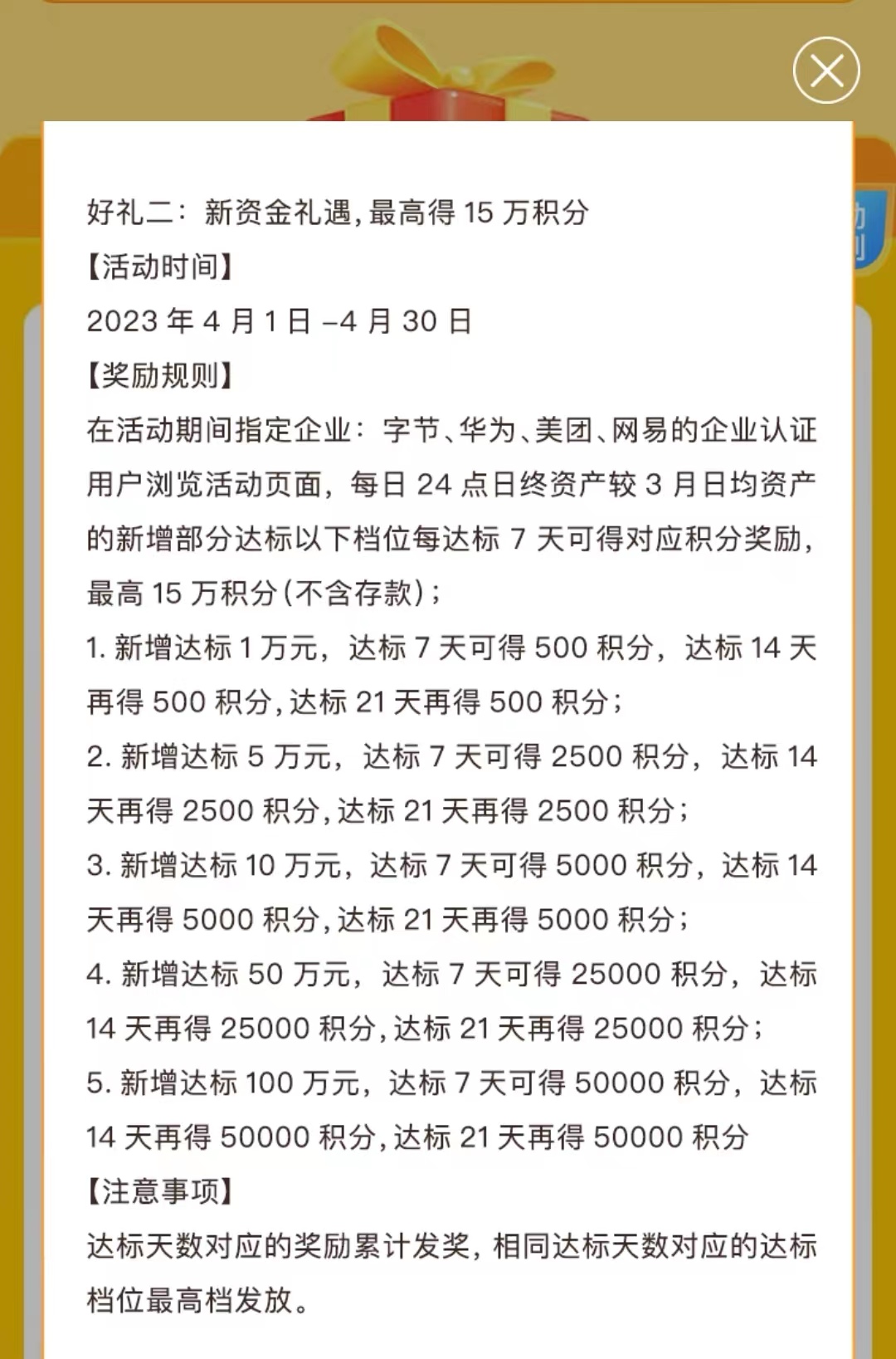 活动二:腾讯、华为、字节、美团、网易员工,每日24点日终资产较3月新增奖励,100万最高可奖励1500元