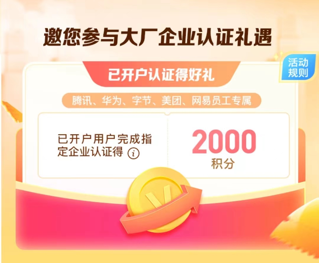 活动一:2023年3月2日至6月1日,腾讯、华为、字节、美团、网易员工,通过邀请新开户,得20元,存入1000元存一天,第二天可得100元奖励。一共可得120元奖励。完成企业认证的用户可领取每月专属收益券、终身黄金会员等超多权益,更有活期+Plus、大额存单+C款等稀缺产品优先体验参与资格。