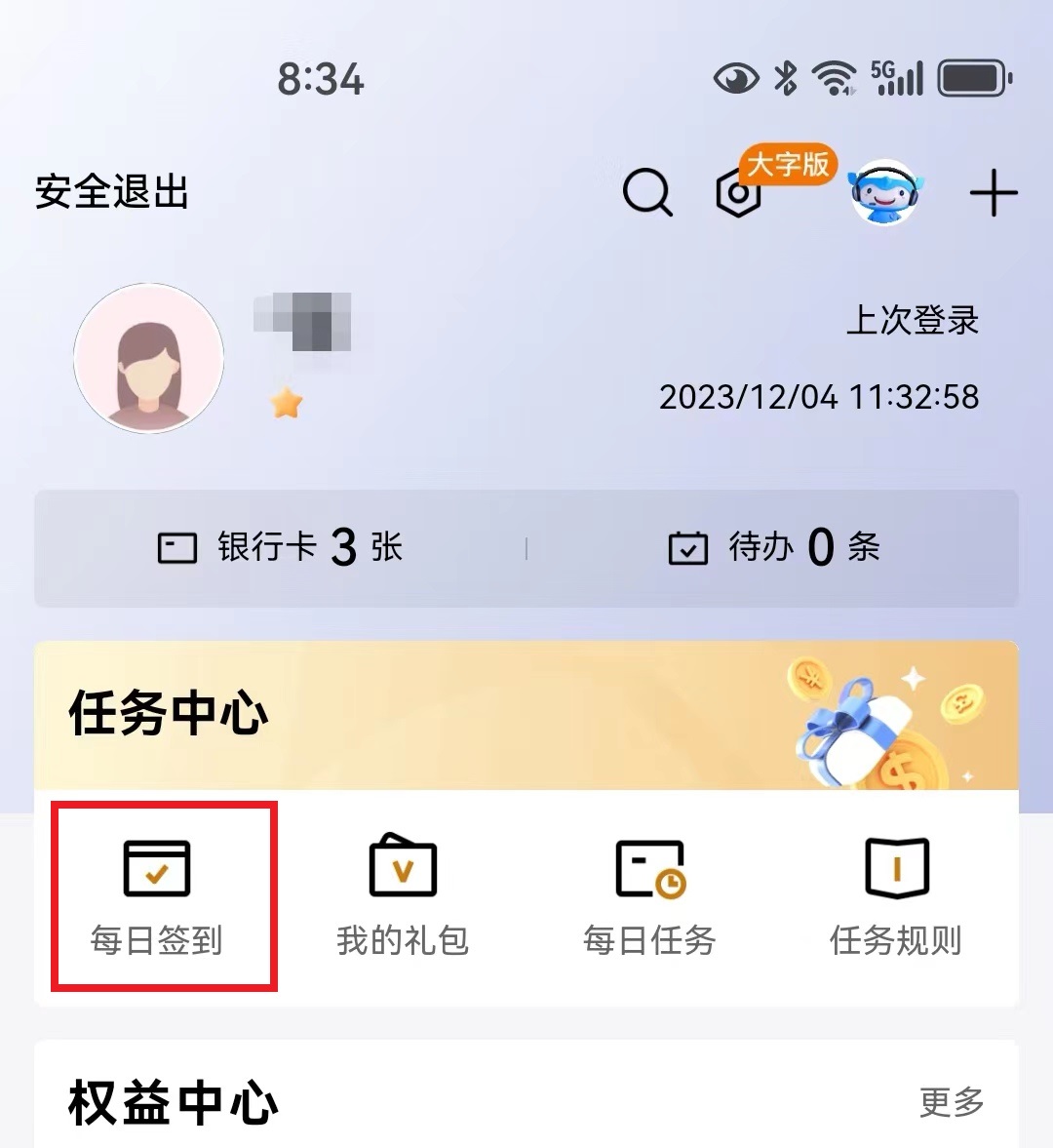 打开建设银行APP,点击“我的”--“-任务中心”---“每日签到”
