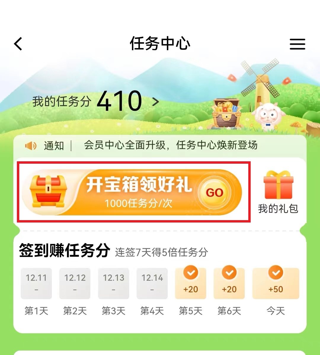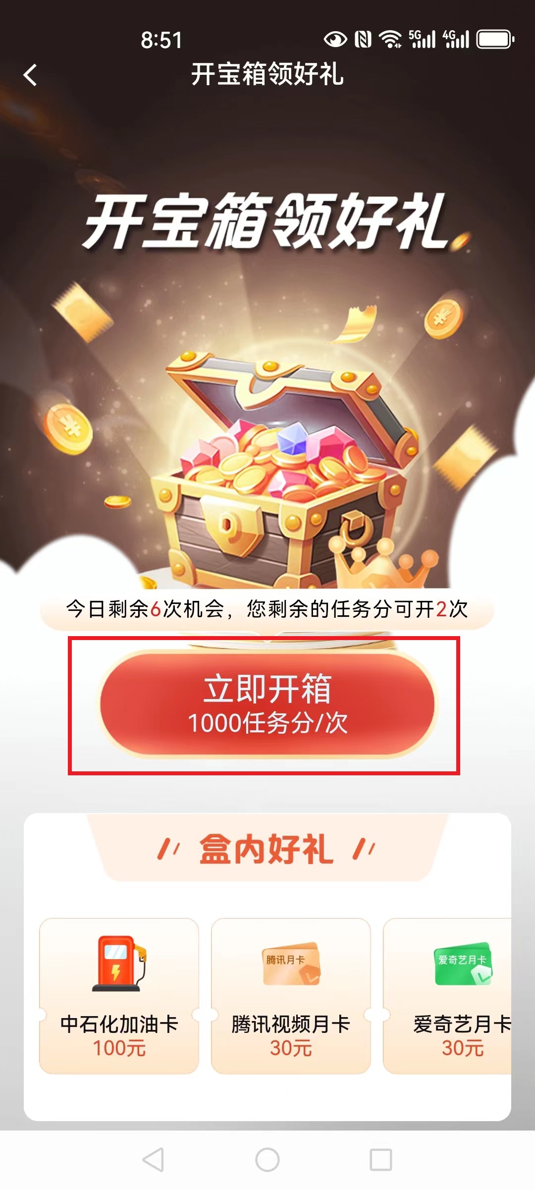 第三步:回到任务中心,点击“开宝箱领好礼”,去抽奖。