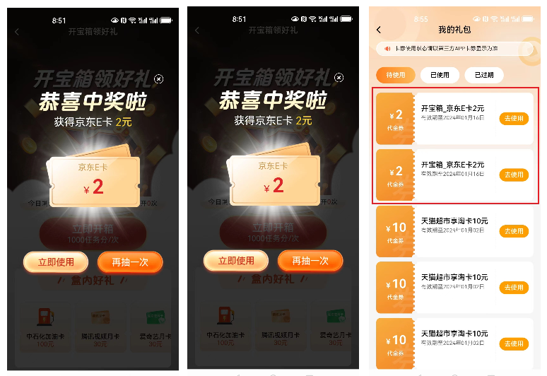 小编的账户抽到2张2元的京东E卡,家里有几个建行账户都可以一起做做。如果积分不够2000,就再去连签几天就行了。