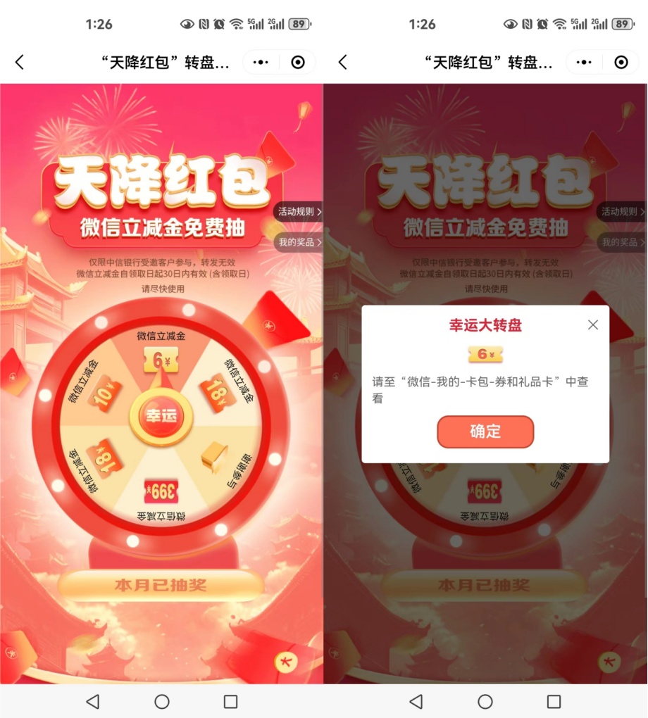 点击短信中的链接,直接跳转到中信银行小程序,授权登录后,进入“天降红包”转盘活动页面,点击抽奖即可。