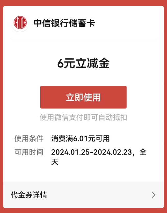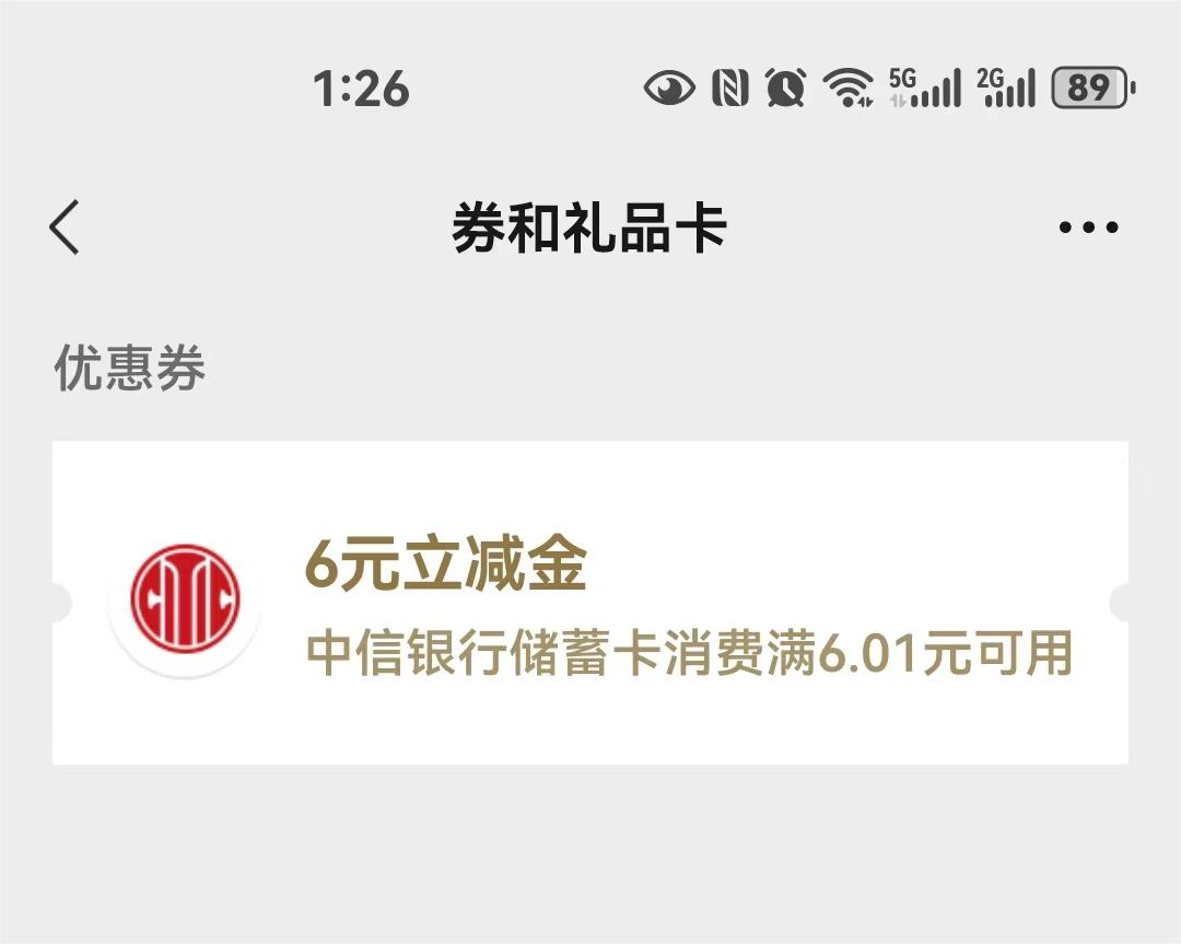 只要你之前在微信里绑定过中信银行的这张卡,在微信-我的-卡包-券和礼品卡,里就可以看到这张微信立减金啦。没绑过的去绑定一下就可以啦。