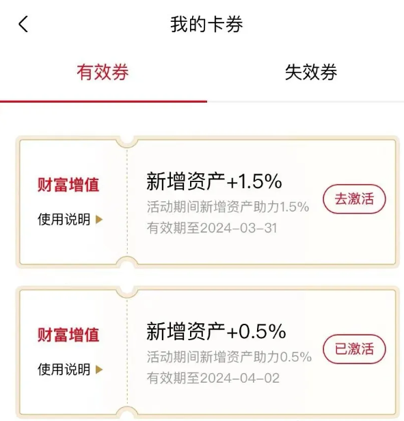 新增资产较2024年2月29日增加部分,前20天加息0.5%,需要手动激活,另外还有一个1.5%的券,这个是3月29日自动激活,连续增值3天,加息1.5%。