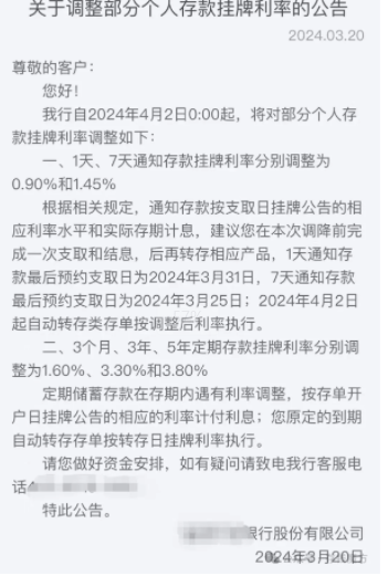 另外,H银行发了降息公告,将于2024年4月2日0时起调整部分存款产品的基础利率。