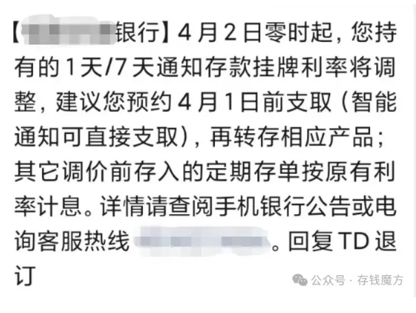 存有1天/7天通知存款的客户注意在4月1日前(提前1天/7天)预约支取一次,把之前存的先结一次息,然后再转存。