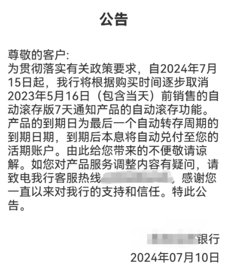 今日Z银行发布公告,将于2024年7月15日起,逐步取消存量用户7天通知存款自动滚存功能。至此之前的传闻得到官方证实。